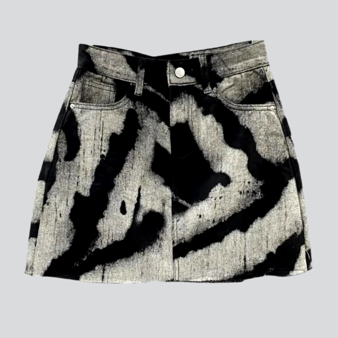 Be bold and stylish this 2023 Spring-Summer season with our unique tie-dyed vintage print denim skirt! Crafted with a mid-waist fit. mini length. and a zipper & button closure. this street-style staple is a timeless classic that will add a chic edge to every look.